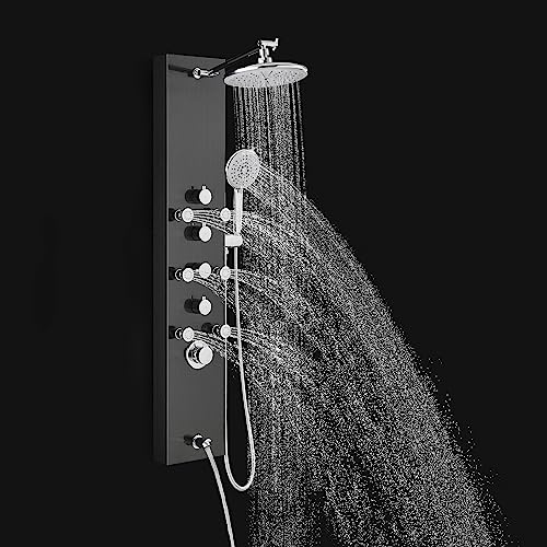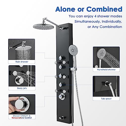 How does this Shower Panel Benefit you? The high pressure 8" rain shower head covers you well and rinses off soap and shampoo easily; The 5-setting shower wand is good for bathing kids and pets; 6 massage jets soothe your tired and sore muscles and relieve pain; Built-in tub spout with aerator makes this shower panel ideal for bathtub use