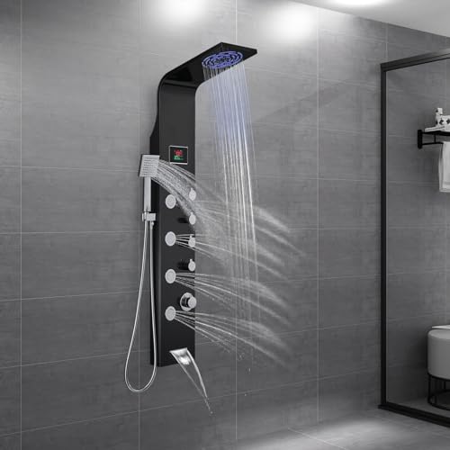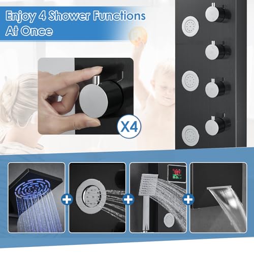 4-Function Shower Column: Sleek shower panel features built-in LED temp display, LED lights rainfall shower, adjustable body jets, tub spout, and handheld shower wand, a complete shower column, you will have various functions that can be combined as you prefer