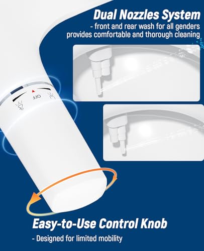 Bidet Modes: SAMODRA bidet attachment for toilet with Dual Nozzle System,which features a Posterior Mode for both men and women, and a Feminine Mode for women's private areas. With a simple rotary switch, you can easily switch between the two modes and adjust the water pressure to your liking.
