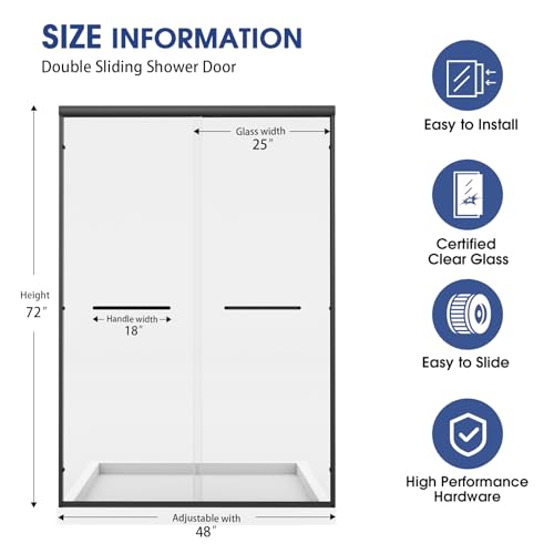 Framed Shower Door - 48" w x 72" H: This adjustable sliding door fits openings from 44" to 48", depending on the model. The top and bottom guide rails can be trimmed to achieve a custom fit, allowing flexible installation across a range of bathroom layouts. Please ensure all measurements are taken after wall finishes (such as tile or back panels) are fully completed. The premium aluminum alloy frame offers excellent rust and corrosion resistance for long-lasting durability