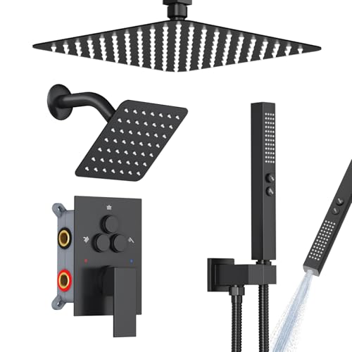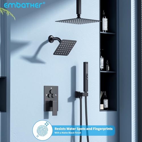 ?Easy-to-Use Push Button Diverter? EMBATHER matte black shower system features a push button diverter that allows you to easily switch and simultaneously activate 3 shower modes: rainfall, wall-mounted shower, and shower head with handheld. Perfect for a customized and hassle-free shower experience.