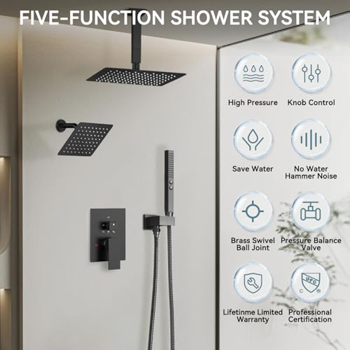 ONE UNIT WITH FIVE FUNCTIONS:The shower faucet set has 10 inch ceiling mounted head and 6 inch wall mounted high-pressure shower head,two overhead showerheads can be used individually or at the same time with a handheld showerhead, the handheld spray two-function design,the spray gun mode features a high-pressure hose, which is widely used to clean pets,wash the floor, bathtub, toilet, etc.This new feature allows for a whole new shower experience.