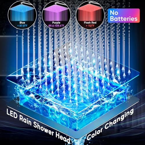 ?LED Rainfall Shower Head?By converting the kinetic energy generated by the high-pressure water flow into electricity, our rain shower head can achieve the function of light, the color of the light is changed with the change of water temperature. The visual temperature can realize the function of preventing burns.?Blue is cold water?Purple is warm water?Flash Red is hot water?