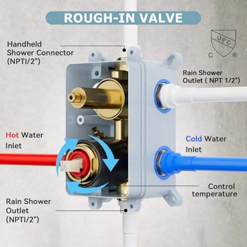 SAVE WATER AND FLOW ADJUSTABLE: Rain shower system with Air-in technology, require up to 30% less water than conventional products.New knob style diverter design function,the button of each function can be rotated to adjust the water volume.Adjust the most comfortable water flow state according to your needs,all while delivering a luxurious, high-pressure shower experience.