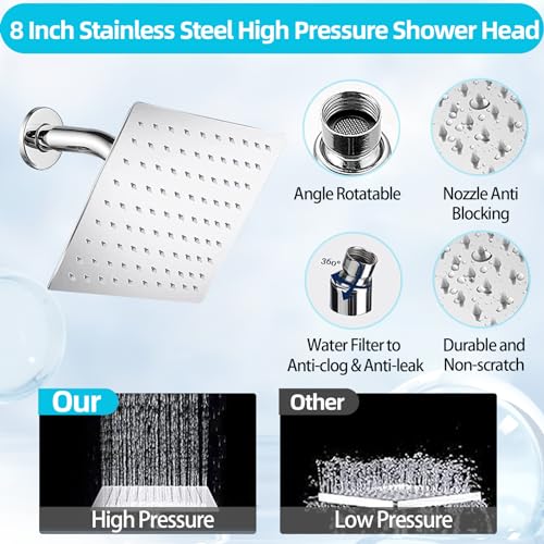 [Large 8" Rainfall Shower Head] The 8" large rain shower head provides you full body coverage shower with waterfall-like flow. Anti-clog technology keep the shower head clean all the time.