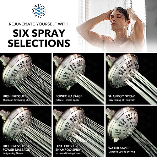 6 UNIQUE SETTINGS FOR REJUVENATING, HIGH-PRESSURE SHOWERS - This ShowerMaxx shower head offers six adjustable spray settings to suit every mood. Its High Pressure setting offers power and coverage; the Power Massage setting relieves muscle tension; choose Power Massage + High Pressure for invigorating full coverage; Shampoo Spray for rinsing; High Pressure + Shampoo Spray for increased rinsing power; and lastly, the eco-friendly Water Saver setting to conserve water while lathering and shaving.
