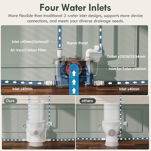 Multi-Inlet Design: Features 4 inlets (1 x 100mm, 3 x 40mm) to connect macerating toilets, tub, showers, and more, providing flexibility for various plumbing setups.