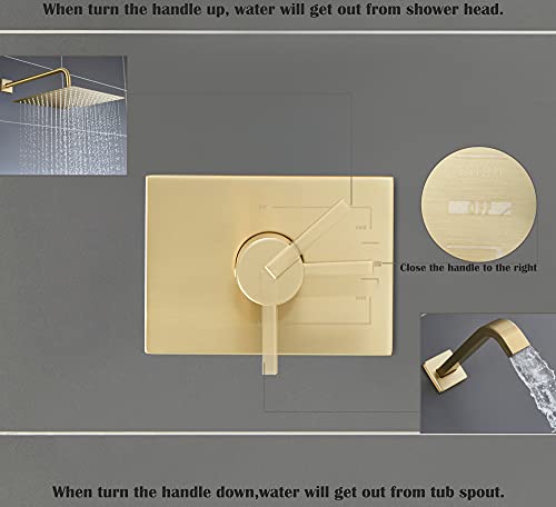 ?????EASY OPERATION?: With single handle for both functional and temperature control, this shower mixer with rain shower and tub spout. Close the handle to the right, rotate the handle until the water get out. When turn the handle up, water will get out from top spray and when turn it down,water will get out from tub spout. the further to the left, the hotter it will be (as shown in the picture). (can not both?