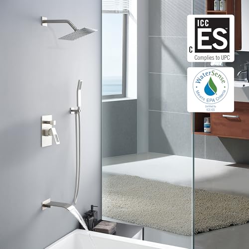 3. This shower system has three modes: waterfall tub spout, rain shower head and hand wand, which could easily switch by turning the square knob on the valve. The lever handle easily adjust the hot/cold water flow and temperature.This shower set features a wide waterfall spout with large water flow (4.17GPM at 60PSI)to quickly fill your bathtub.