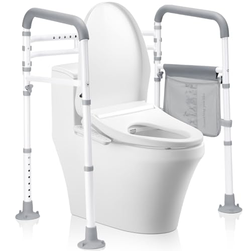 Thoughtful Design: Equipped with four strong suction cups, the toilet rail securely grips the floor for maximum stability and reliability. The handles feature soft gray foam grips, ensuring a secure and comfortable hold. Our toilet safety rail also includes a storage pouch, perfect for keeping newspapers, magazines, or mobile phones within reach.