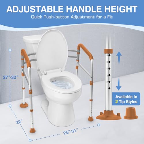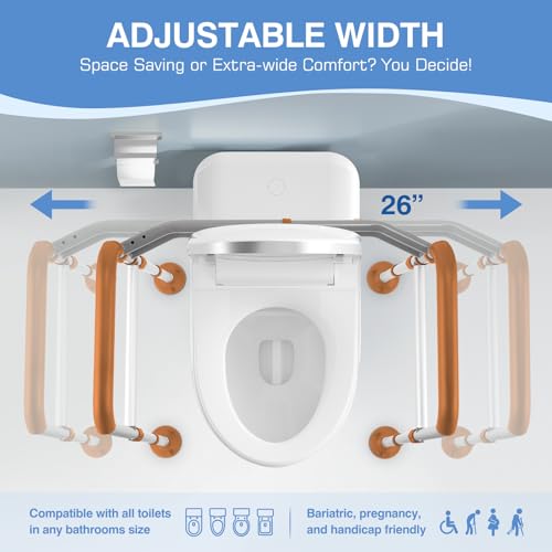 Adapts to Most Toilets and Users : Our toilet safety frames have an easy width-adjustibility which can be quickly adjust to your desired width(25"-31"). Either you need a small foot-print for your apartment or require extra wide for your bidet, our stand alone safety assitance will fit right in. The toilet rails have six height adjustments to accommodate users of various heights, making it easier to sit down and stand up safely.