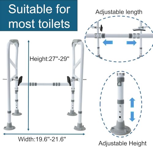 Our toilet safety frame is adjustable, allowing the height from 26" to 28" and width from 12" to 17"
