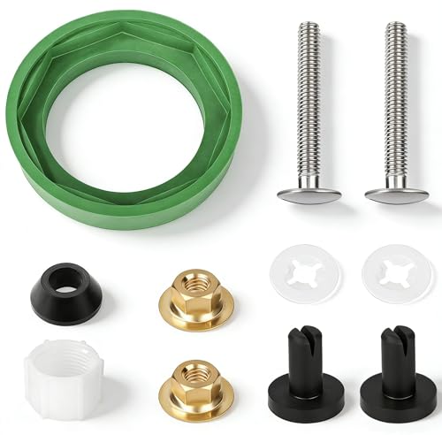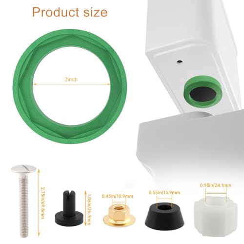 Perfect Replacement: Our Toilet Tank to Bowl Coupling Kit is the ideal solution for repairing most two-piece toilets, Toilet coupling kit includes 3'' Green toilet tank gasket x1, speed connect tank to bowl bolt kit- white washer x1pc and black ring x1pc, long toilet tank bolts x2pcs,hexagonal nuts x2 and black locking rings x2pcs. This kit provides all the necessary components for a seamless replacement. No more leaking toilets and no need to replace the entire unit.