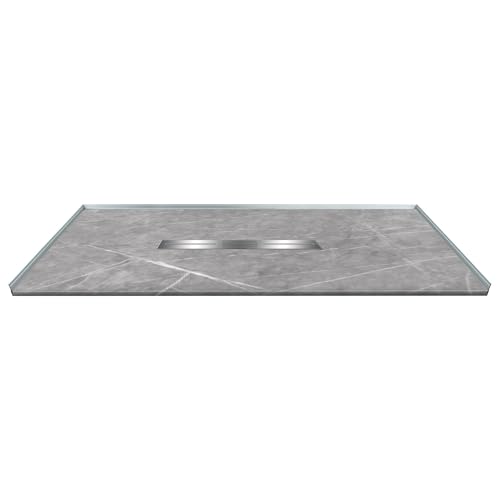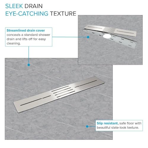 DRAIN: center drain location with modern rectangular stainless steel drain cover that conceals a conventional 2-in shower drain, creating a pleasing uniform and minimalist design; drain not included