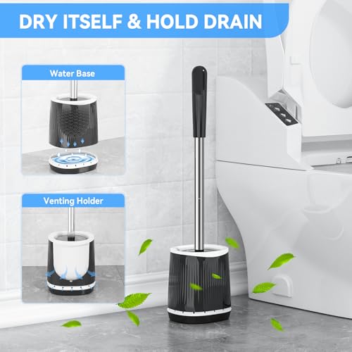 UPGRADED VENTILATION HOLDER: Featuring a built-in drainage system with drip catcher, the toilet brush holder allows airflow to speed up the drying process. Proper ventilation helps maintain a healthier bathroom environment & extends the life of the brush. Note: you can put out holder's stickers away if choose floor standing.