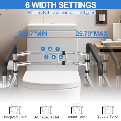 ADJUSTABLE WIDTH & HEIGHT: This portable folding toilet safety rail stand alone can be adjusted to fit six different widths, ranging from 20.87 to 25.79 inches in increments of 0.8 inches, allowing you to customize perfect width for your toilet. Our collapsible toilet safety support rails have eight height adjustments, and the easy-to-use adjustment design allows you to customize heights from 25.98" to 32.6" freely, making it suitable for people of most heights without requiring multiple frames.