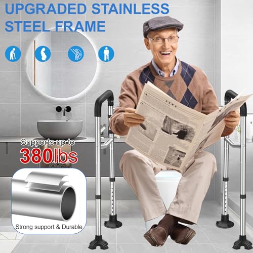 EXTRA SUPPORT & ULTRA-COMFORT GRIP: This sturdy stainless steel toilet support rail features suction cups on the rear legs to provide additional stability, while the front legs feature slip-resistant rubber pads that keep the frame stable, even on tile grout, providing a safe and reliable toileting experience for you and your family. Durable toilet rails for elderly have soft black foam handles all around to ensure steady support,allowing you to hold onto them firmly whether sitting or standing.