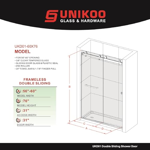 Double Frameless Shower Door: Allow up to 3/8 in. of adjustability to align with out-of-square walls, this helps with the installation process and assures that your product will continue to function for years to come by canceling the effect of wall shift that may occur over time. 56 in. to 60 in. adjustable width by 76 in. H, provides an wide opening width for comfortable and easy access in and out of your shower.