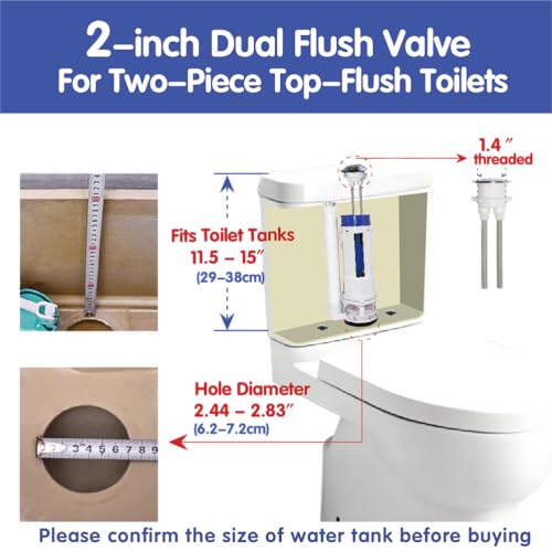 Wide Compatibility:This dual flush valve kit is compatible with most 2-inch two-piece toilets. Before purchasing, please confirm your toilet's drain hole diameter is between 2.44 inches and2.83 inches , tank height is between 11.5 inches and 15 inches , and tank lid hole diameter is between 1.4 inches and 1.57 inches. Compatible with most brands