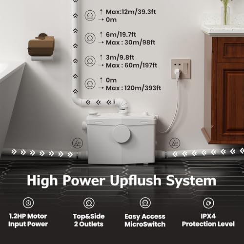 Basement Upflush System -- The macerator pump is capable of pumping wastewater up to 36 feet vertically and 360 feet horizontally. It can effectively handle sewage from 4 household fixtures including washing machines, sinks, bathrooms, and toilets simultaneously. This capability not only efficiently manages household sewage disposal but also makes it ideal to be installed in basements or areas below the main sewer line where traditional plumbing may be impractical.