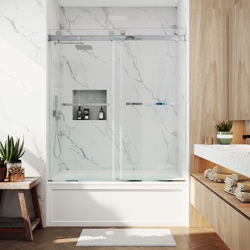 ?Double Sliding Width Adjustable ?- Recommended installation 56-60 inch Width adjustable x 60 inch Height. Stainless Steel top guide bar can be trimmed up to 4 inch for width adjustment. Walk-in width: 24.5-29.5 in. maximizing your bathroom layout. The frameless design provides a spacious and unobstructed view of your bathroom space, perfectly with the modern elements of your bathroom.