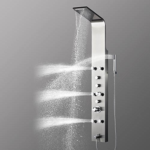 MULTI-STAGE SHOWER FUNCTION----Rainfall,Waterfall Shower Head,Horizontal Massage Spray, Hand Shower,Water Spout | Independent valve control for each shower function, The shower panel tower all functions can be turned on at the same time.