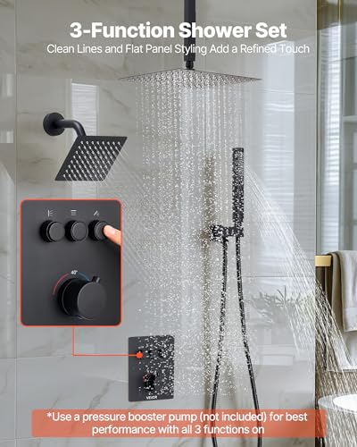 3-Function Shower System: Includes a 2-mode handheld shower, side shower, and overhead shower. Three independent buttons and a control knob let you switch water outlets and adjust temperature with ease. Supports simultaneous flow. Sleek, modern look with concealed plumbing.