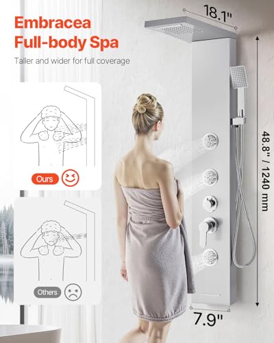 5-in-1 Shower System: This shower panel tower system covers rainfall, waterfall, 3 large massage body jets covering the entire body, bathtub spout, handheld showerhead. It meets diverse needs, from quick rinsing to deep relaxation.
