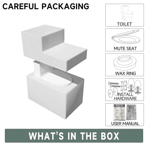 ?All-in-One Secure Packaging?The 19 inch one-piece tall toilet comes with all necessary installation parts (including the skirt toilet, mute seat, wax ring, and mounting screws) integrated into a single package, reducing shipping damage and simplifying transportation.To prevent breakage during delivery, the modern toilet is packaged in a thickened outer carton with internal foam cushioning, providing all-around protection.