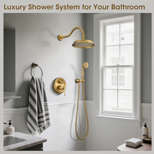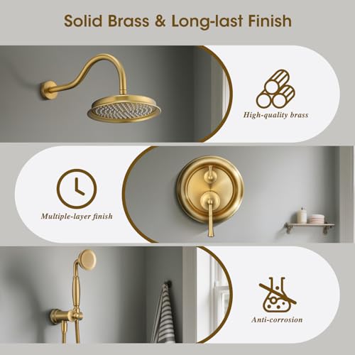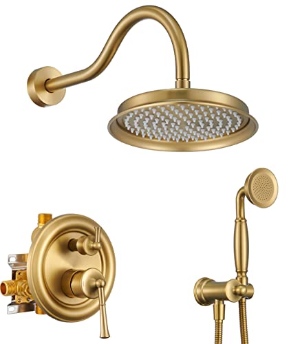 ?BRUSHED GOLD FINISH SHOWER HEAD?WINKEAR's roman and elegant wall mount shower faucet set with a streamlined design that makes it a great fit for any type bathroom. Solid brass construction for handheld shower and rain shower, promises you a long lasting use quality. WINKEAR brushed gold finish with glaze sealing process to prevent water spot and fingerprints, which will not fade over time.
