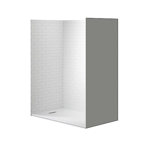 ? [KIT INCLUDES]: Kit includes a piece of 60 in. x 75 in. back wall panel, two pieces of 32 in. x 75 in. side panels, and a piece 60 in. x 32 in. low profile with zero threshold shower base in white features a Reversible drain, Brushed Nickel Drain Cover