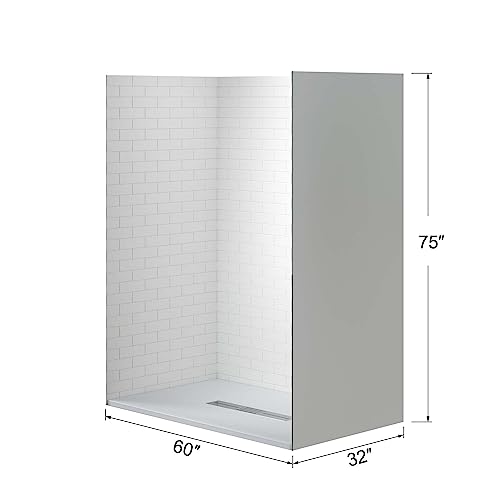 ? [KIT INCLUDES]: Kit includes a piece of 60 in. x 75 in. back wall panel, two pieces of 32 in. x 75 in. side panels, and a piece 60 in. x 32 in. low profile with zero threshold shower base in white features a Center drain, Brushed Nickel Drain Cover