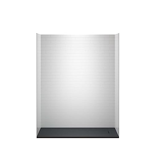 WOODBRIDGE 60 in. L x 32 in. W x 75 in. H Alcove Solid Surface Shower Combo Kits with Glue Up Shower Walls in High Gloss White and Curbless Shower Base with Reversible Drain in Black
