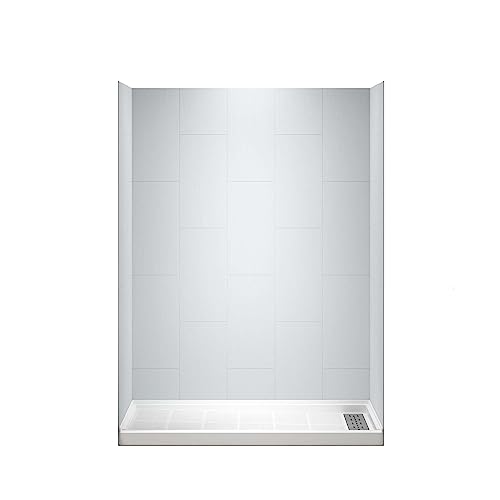 ? [COMBO KIT INCLUDES]: Kit includes a piece of 60 in. x 75 in. back wall panel, two pieces of 36 in. x 75 in. side panels, and a piece of 60 in. x 36 in. Single Threshold Shower Base in White features a Right drain, Brushed Nickel Drain Cover