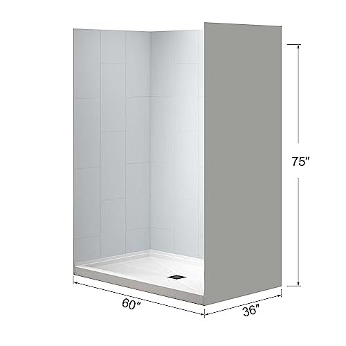 ? [COMBO KIT INCLUDES]: Kit includes a piece of 60 in. x 75 in. back wall panel, two pieces of 36 in. x 75 in. side panels, and a piece of 60 in. x 36 in. Single Threshold Shower Base in White features a Center drain, Matte Black Drain Cover