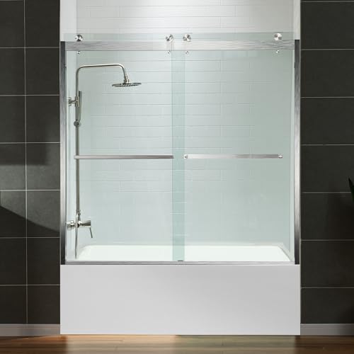 WOODBRIDGE Frameless Bathtub Shower Doors 56-60" Width x 62" Height with 3/8"(10mm) Clear Tempered Glass, 2 Ways Opening & Double Sliding in Brushed Nickel Finish