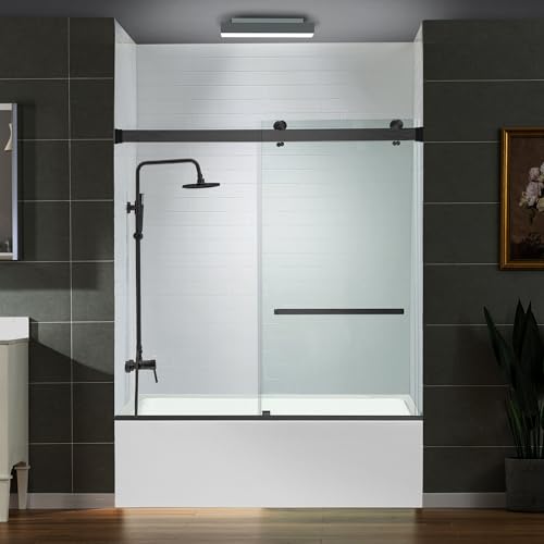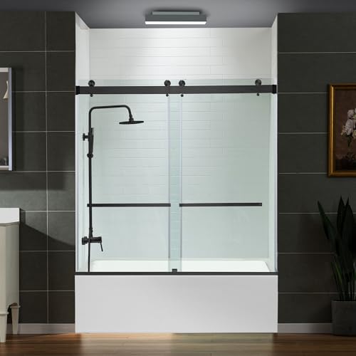 Woodbridge Frameless Bathtub Shower Doors 56-60" Width x 66" Height with 5/16"(8mm) Clear Tempered Glass, 2 Ways Opening & Double Sliding in Matte Black Finish