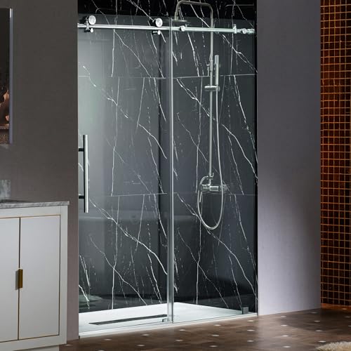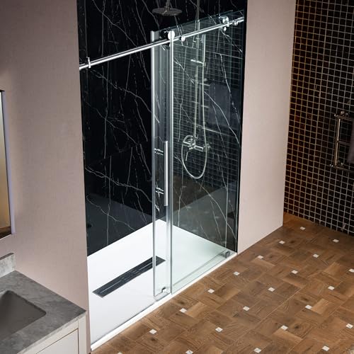 ? [HIGH QUALITY MATERIAL]:3/8"(10mm) thick tempered safety glass with ANSI Z97.1 certified, for easy cleaning and to resist water spots; Large solid stainless steel rollers creating a quiet, smooth and effortless sliding