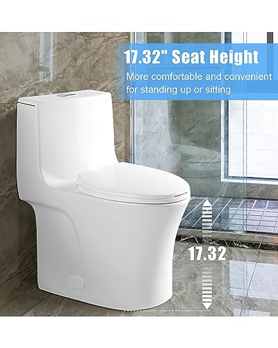 ?Adult-Friendly Comfort Height?The 17.3" elongated bowl height makes sitting and standing easier, Compact toilet for small bathrooms caters to most adults. Ergonomic design ensures added comfort.