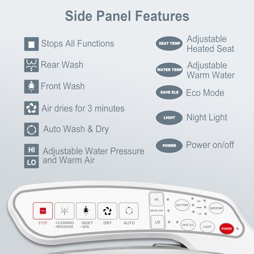 FEATURES - This toilet seat has water heater with 3 temperature settings, heated seat with 3 temperature settings, water pressure with 3 temperature settings, warm air dryer with 3 different levels, and save preferred settings.